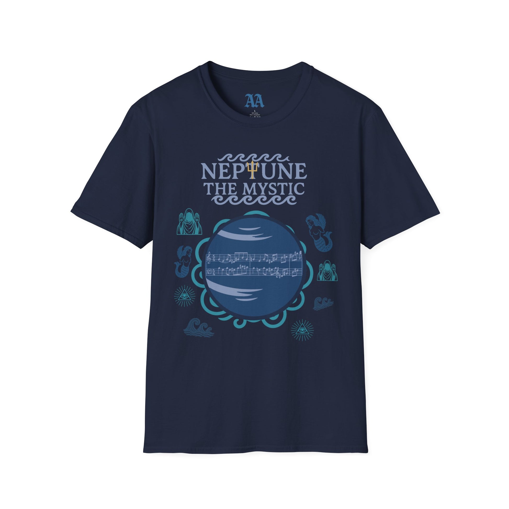 The ethereal flute and clarinet motif that opens the last movement of Holst's Planets is proudly displayed on this t-shirt. Various symbols depict the mystical sea god Neptune.