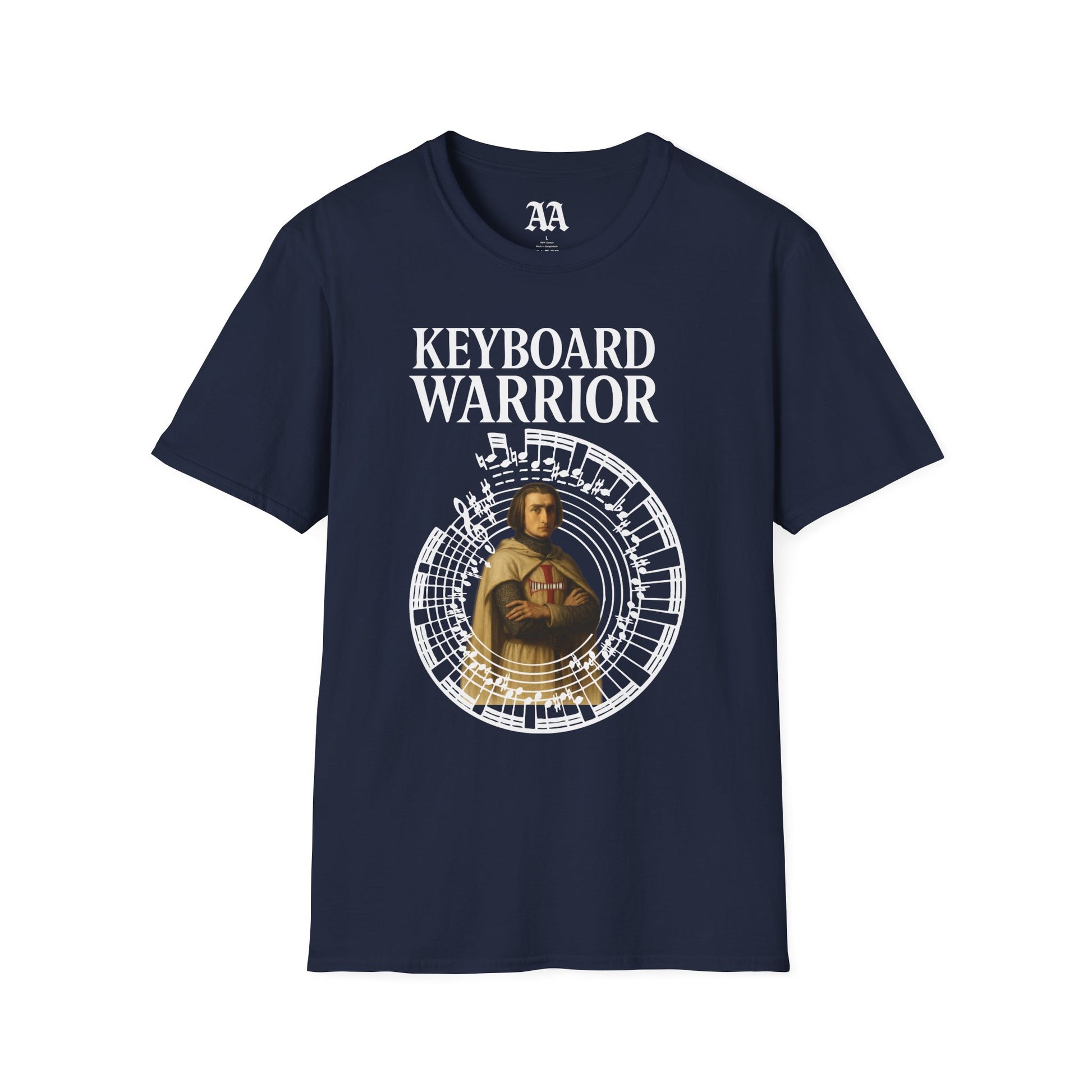 Unleash the heroic virtuosity of Romantic-era piano with our "Keyboard Warrior" T-shirt- a bold tribute to Franz Liszt at his most ferocious. Featuring the legendary composer armored as a Templar knight, this design blends mythic chivalry with musical mastery. Encircling Liszt is an excerpt from one of the cadenzas in his first Mephisto Waltz.