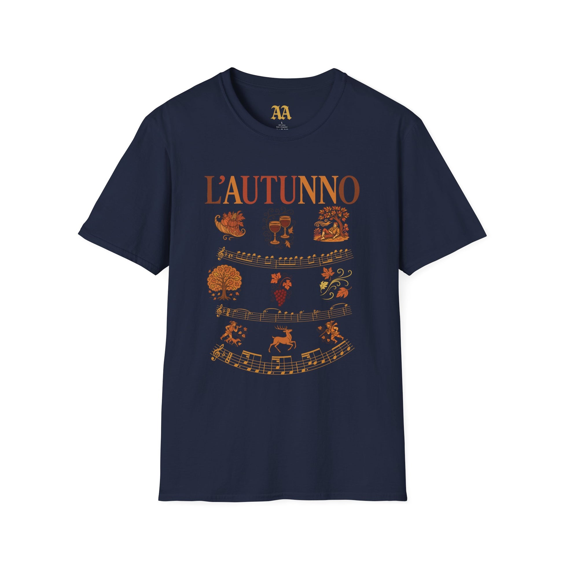 Toast harvest season with Vivaldi's Autumn (Italian L’autunno), featuring three legible score panels that capture rustic dances, mellow slumber, and the lively hunt. Warm, rhythmic, and very wearable.